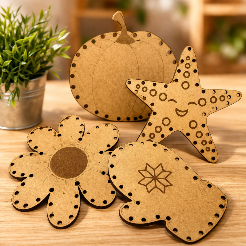 Set de 4 tablas de costura en madera, diseñadas con formas temáticas de cada estación: estrella de mar (verano), flor (primavera), calabaza (otoño) y manopla (invierno). Cada pieza incluye perforaciones alrededor para insertar lana o cordones, permitiendo a los niños practicar costura, ensartado y enhebrado. Es un recurso perfecto para desarrollar la motricidad fina, la coordinación mano-ojo y la paciencia, al mismo tiempo que se relacionan las figuras con las estaciones del año.
