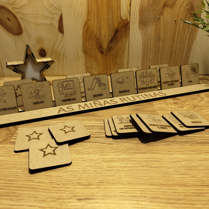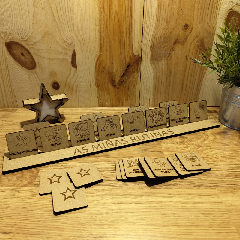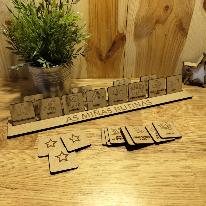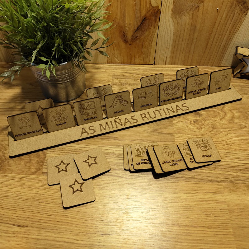 El panel incluye una base de 47 x 7 cm en madera MDF y 14 fichas ilustradas con pictogramas grabados a láser, que representan de manera clara y sencilla cada momento del día.